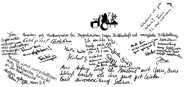 Wirkungsweise : Medikament wirkt beruhigend bei Anspannungszuständen (Panik ?) während Klausuren; auch im außerschulischen Bereich führt die Einnahme zu großer Offenheit und unbeschwerter Atmosphäre (= 4 Kurstreffen); unzählige Geschichten privater und schulischer Natur sorgten für Heiterkeit; viel Menschlichkeit und ein stets offenes Ohr für die Schüler ist hier als besonders positiv bervorzuheben; um eine optimale Wirkung zu erzielen, ist ein gewisses Maß an Eigeninitiative erforderlich